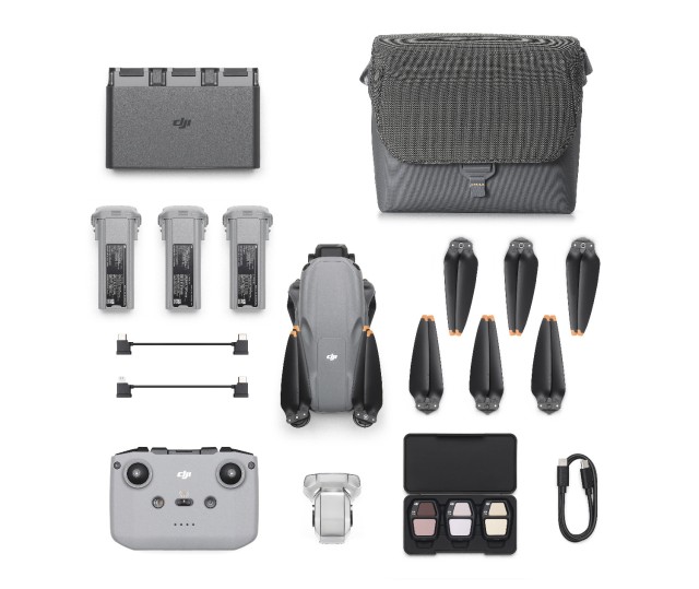 Komplet DJI Air 3S Fly More Combo Kit (DJI RC-N3) vključuje daljinski upravljalnik DJI RC-N3, komplet filtrov ND, dve dodatni bateriji, polnilno vozlišče, torbo za na ramo in drugo dodatno opremo. V prodaji od 15. oktobra 2024.