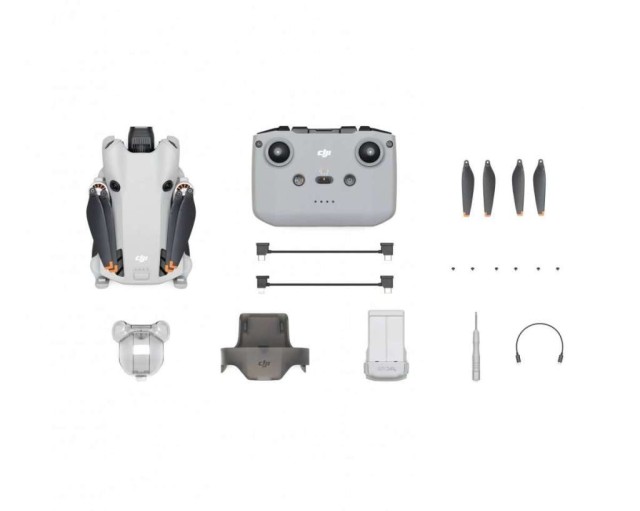 1x dron DJI Mini 4 Pro, 1x daljinski upravljalnik DJI RC-N2, 1x kabel RC Micro USB-C, 1x kabel RC Lightning, 1x pametna baterija, 1x nadomestni propeler z nizkim hrupom (par), 6x vijaki, 1x vijačnik, 1x pokrov gimbala, 1x držalo propelerja, 1x napajalni kabel USB-C na USB-C