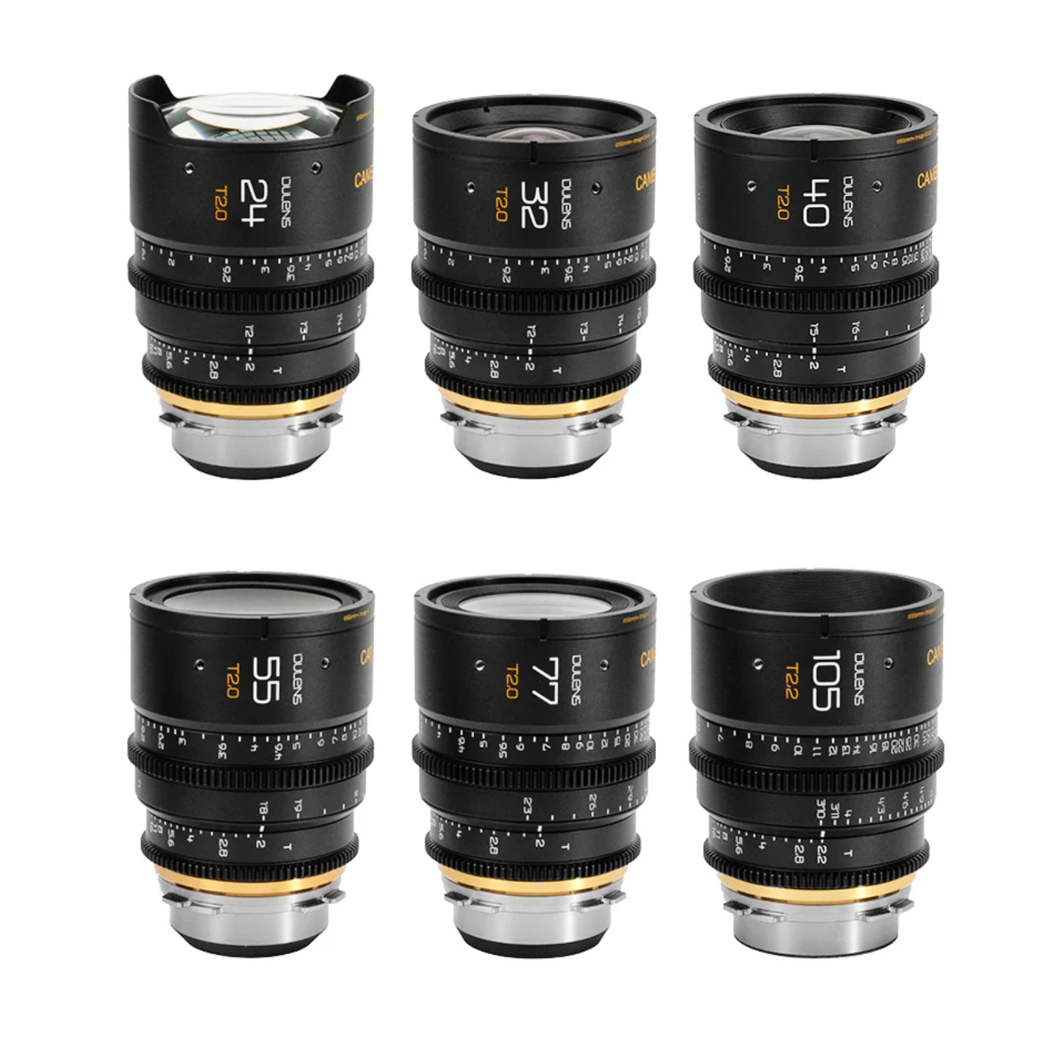 Dulens APO Cambrian Prime 6-objektivni komplet (24/32/40/55/77/105 mm T2.0) PL-priključek, črn Metrika: Polni srednjeformatni/Vista Vision/velikoformatni kinematografski objektivi s sferičnim dizajnom APO, ultra široko zaslonko T2.0, kremastim bokehom v vintage slogu, enotnim prednjim premerom 80 mm, lahkotno aluminijasto konstrukcijo (<850 g vsak), V+ premazom za nostalgičen odblesk in mikro kontrast – idealni za profesionalno pripovedno, komercialno in velikoformatno filmsko ustvarjanje.