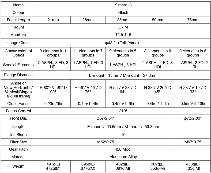 Thypoch Simera-C Komplet 5 objektivov 21/28/35/50/75mm T1.5 (Leica M Mount)