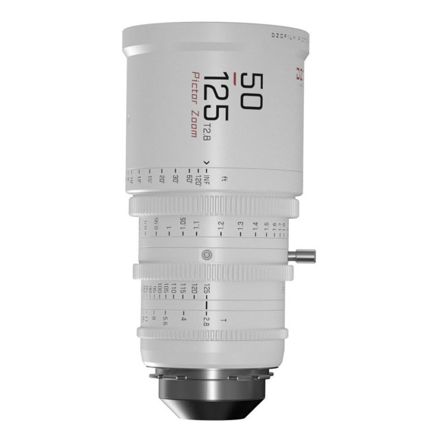 Parfokalni filmski objektiv DZO Pictor 50-125 mm T2,8 pokriva senzorje formata Super 35 / APS-C, ponuja zaslonko T2,8 v celotnem območju goriščne razdalje in je opremljen z izmenljivima bajonetoma PL in EF. Zasnova objektiva praktično odpravlja dihanje in zagotavlja ostro risbo v celotnem območju ter lep prikaz prizora zunaj globinske ostrine zaradi zaslonke objektiva 16. Obročki za ostrenje, zaslonko in zoom so seveda nazobčani za enostaven daljinski nadzor s sistemi za stransko ostrenje (M0,8; premik obročka za ostrenje za 270°). Prednji premer je standardnih 95 mm za običajne kompendije, filterski navoj je 86 mm. Na voljo je tudi nogica za podporo objektiva v opremi. Bela različica. Teža približno 1700 g. Za bajonete PL in EF.
