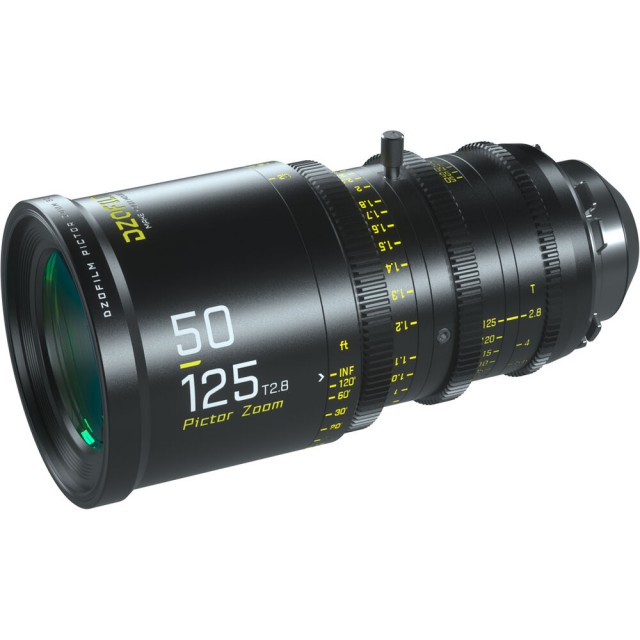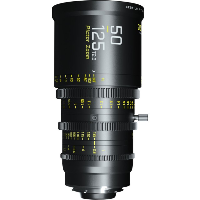 Parfokalni filmski objektiv DZO Pictor 50-125 mm T2,8 pokriva senzorje formata Super 35 / APS-C, ponuja zaslonko T2,8 v celotnem območju goriščne razdalje in je opremljen z izmenljivima bajonetoma PL in EF. Zasnova objektiva praktično odpravlja dihanje in zagotavlja ostro risbo v celotnem območju ter lep prikaz prizora zunaj globinske ostrine zaradi zaslonke objektiva 16. Obročki za ostrenje, zaslonko in zoom so seveda nazobčani za enostaven daljinski nadzor s sistemi za stransko ostrenje (M0,8; premik obročka za ostrenje za 270°). Prednji premer je standardnih 95 mm za običajne kompendije, filterski navoj je 86 mm. Na voljo je tudi nogica za podporo objektiva v opremi. Črna različica. Teža približno 1700 g. Za bajonete PL in EF.