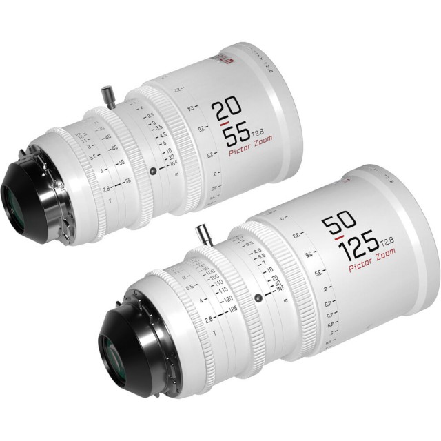 Kompletobjektivov DZOFilm Pictor 50-125mm T2.8 S35 in DZOFilm Pictor 20-55mm T2.8 S35 v beli barvi, vključno s kovčkom. Za bajoneta PL in EF.