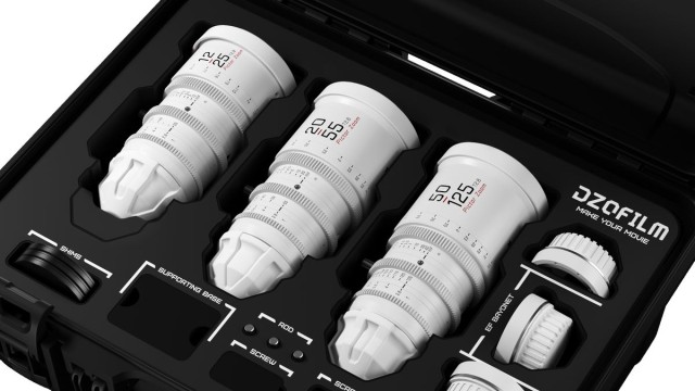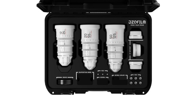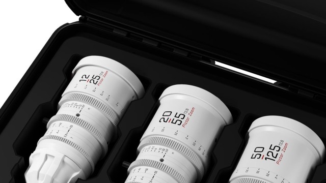 Komplet treh objektivov DZOFilm Pictor Zoom T2.8 - 12-25 mm, 20-55 mm in 50-125 mm - v kovčku. Vsak objektiv je standardno opremljen z bajonetom PL, vključuje pa tudi zamenljiv bajonet Canon EF za združljivost s številnimi digitalnimi filmskimi fotoaparati.