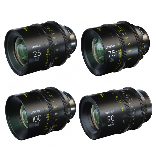 Komplet objektivov DZOFilm Vespid 25, 75 in 100 mm T2.1 ter 90 mm Macro T2.8 za bajonet EF.