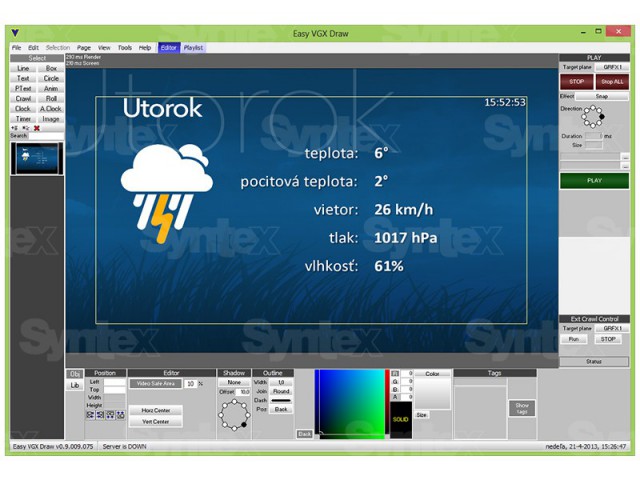 Pri ustvarjanju besedil ali celotnih odstavkov je mogoče uporabiti pisavo, ki je nameščena neposredno v operacijskem sistemu. Če imate vzhodnoevropske pisave TrueType z naglasi, jih bo CG prikazal brez težav. Besedilne informacije lahko v CG vstavite neposredno v razdelek Oblikovalec ali pa jih pridobite iz zunanjih virov - besedilne datoteke, imenika, XML ali RSS. Nastavite samo osnovne parametre, kot so umestitev besedila, pisava, velikost, poravnava, barva, prosojnost in drugi parametri, CG pa bo dejansko vsebino prevzel iz vira.