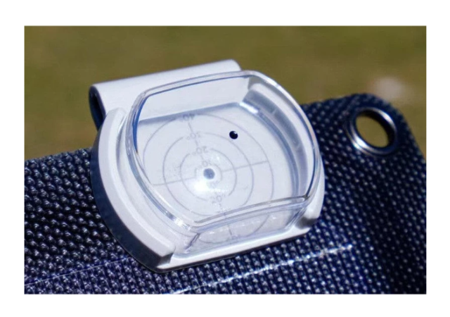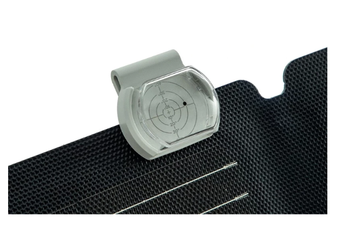 EcoFlow Solar Angle Guide (1ECOSAG) je zasnovan tako, da vam pomaga učinkovito izkoristiti sončno energijo, saj sončne celice ohranja popolnoma poravnane s sončnimi žarki. Zaradi kompaktne in lahke zasnove (50 × 54 × 30 mm, 25 g) se ta vodilo enostavno pritrdi na rob katere koli sončne celice. Preprosto poravnajte panel tako, da sonce sije skozi prozoren pokrov, in ga prilagodite, dokler senca ne doseže središča vodila. S tem zagotovite, da je vaš panel pravokoten na sončne žarke, kar poveča sončni dobiček in skrajša čas polnjenja.