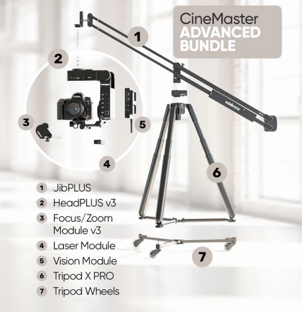 Edelkrone CineMaster Bundle - Advanced ponuja celoten sistem za nadzor gibanja, vključno z JibPLUS, HeadPLUS v3, modulom za ostrenje/pomanjšanje, modulom za vid, laserskim modulom, stativom X PRO in kolesi za stativ. Zagotavlja natančne, kinematografske premike kamere za profesionalce, ki želijo z lahkoto in prilagodljivostjo ustvariti očarljive posnetke.