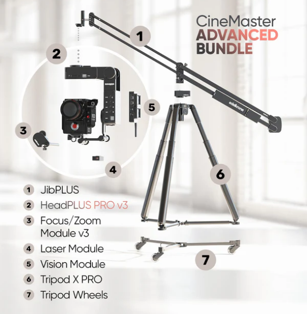JibPLUS omogoča obsežne navpične in vodoravne posnetke s konico, HeadPLUS PRO v3 pa gladke nastavitve obračanja in nagiba. Priloženi modul Focus/Zoom Module v3 omogoča natančno ostrenje in nadzor povečave, laserski modul pa pomaga pri zagotavljanju poravnave za popolne posnetke. Modul Vision omogoča povratne informacije o fotoaparatu v realnem času in tako izboljša postopek snemanja. S temi funkcijami lahko zlahka dosežete zelo dovršene filmske posnetke.