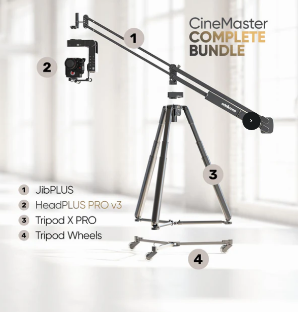 Edelkrone CineMaster Complete Bundle ponuja popolnoma integriran motoriziran sistem kamere z JibPLUS, HeadPLUS PRO v3 in dodatno opremo, ki profesionalnim filmskim ustvarjalcem omogoča kompleksne, gladke in natančne premike kamere za filmske posnetke.