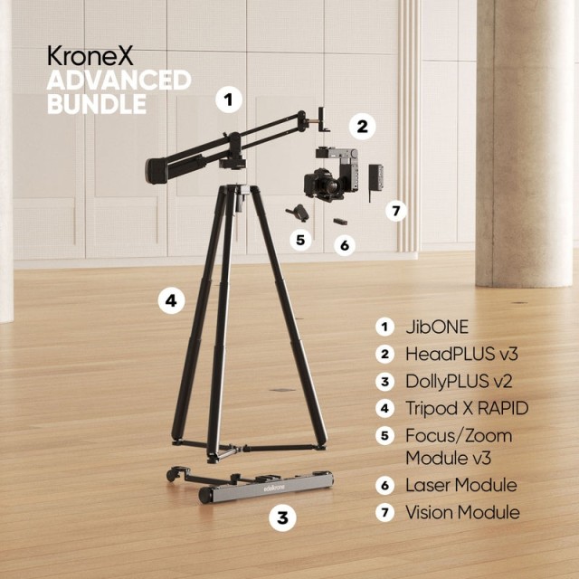 Edelkrone KroneX Bundle - Advanced: vključuje HeadPLUS v3, JibONE v3, DollyPLUS v2 , Tripod X RAPID, modul za ostrenje/pomanjšanje v3, laserski modul in modul za vid za natančno premikanje fotoaparata in dinamično snemanje.