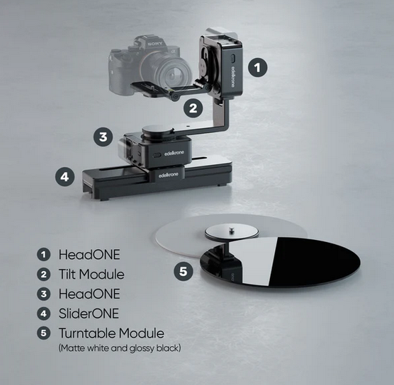- Sestavni deli paketa: 2x HeadONE v2, SliderONE v3, modul TurnTable, modul Tilt