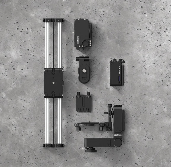 Kompletni paket Edelkrone SlideMaster, ki vsebuje SliderPLUS PRO Long, motorni modul, vertikalni modul in HeadPLUS v3 za natančen in vsestranski nadzor gibanja.