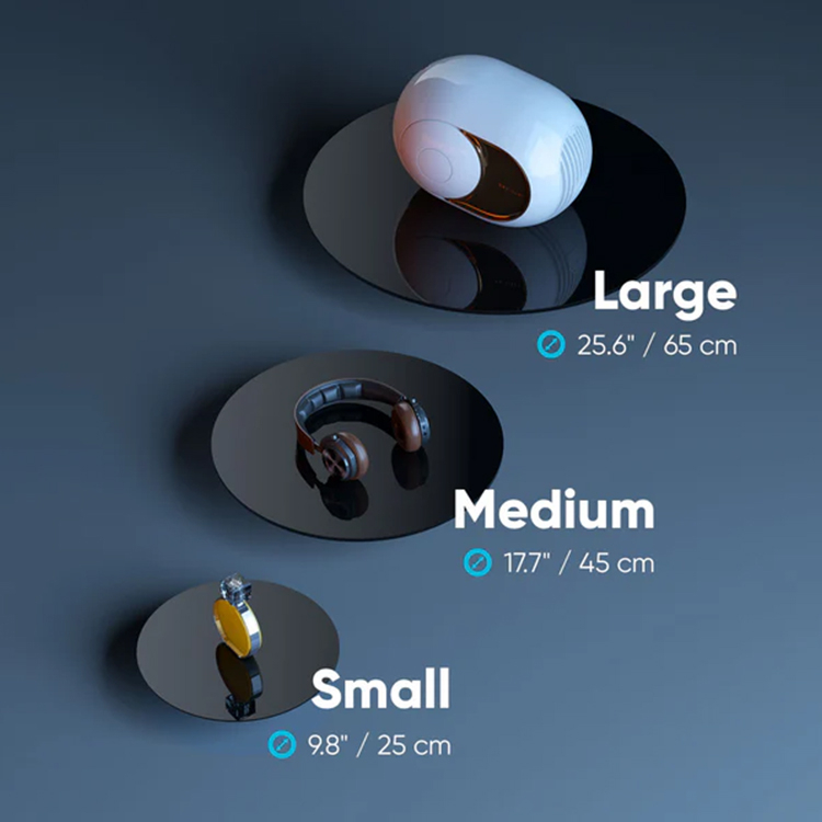 Modul vrtljive mize je zasnovan za nemoteno obračanje izdelka za 360° in je na voljo v treh velikostih, ki ustrezajo različnim potrebam. Srednji in veliki modeli imajo stojalo iz pleksi stekla za večjo stabilnost.