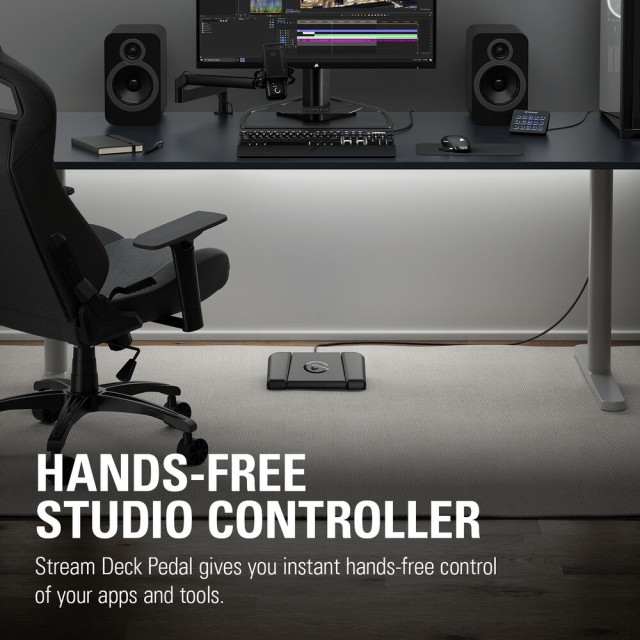 ElgatoStream Deck pedal je odlično dopolnilo Elgato Stream Deck MK2, saj omogoča prostoročno upravljanje aplikacij in instrumentov ter je popolnoma združljiv z drugimi Corsairovimi klaviaturami in kontrolerji. Nožni pedal Stream Deck, ki je opredeljen kot pedal z otipljivimi upravljalnimi elementi na vaših nogah, vključuje tri pedale, ki so pripravljeni za sprožitev neomejenega števila dejanj. Z enim dotikom lahko upravljate programsko in strojno opremo. Pedal za noge Stream Deck, ki je v trpežnem ohišju z nedrsečimi nogami, ki jih imenujemo "oprijemljive pedale" za boljši in natančnejši oprijem, poveča vašo produktivnost in poenostavi vaš delovni proces z dodajanjem prostoročnih upravljalnikov in funkcij.