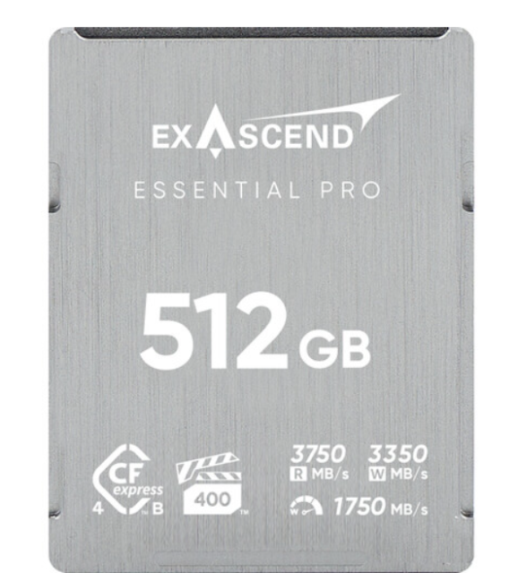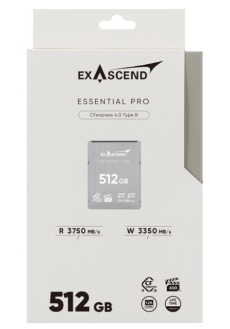 Kartica Exascend EXPC4EB512GB Essential Pro CFexpress 4.0 Type B 512 GB omogoča hitrost branja 3750 MB/s in hitrost pisanja 3350 MB/s za videoposnetke 8K/12K 120 fps. Ima certifikat VPG-400 z Adaptive Thermal Control, vzdržljivostjo 300 TB TBW in doživljenjsko garancijo z obnovitvijo podatkov.