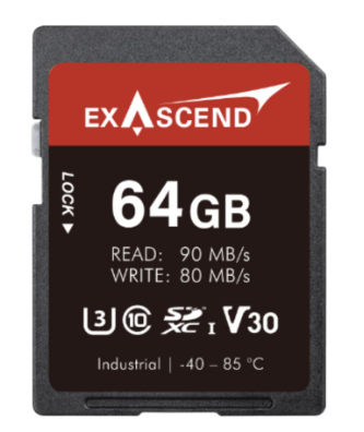Exascend EX64GSDV30-IDE je 64 GB industrijska SD kartica (serija SD300) s 3D TLC / pSLC NAND, ki omogoča hitrost branja do 90 MB/s in hitrost pisanja do 80 MB/s. Ima oceno V30/U3/C10/A2, deluje pri temperaturah od -40 °C do +85 °C s sistemom za spremljanje stanja SMART, 2.000.000 ur MTBF in vhodno napetostjo 2,7–3,6 V – idealna za robustne 4K videoposnetke, nadzor in vgrajene sisteme.