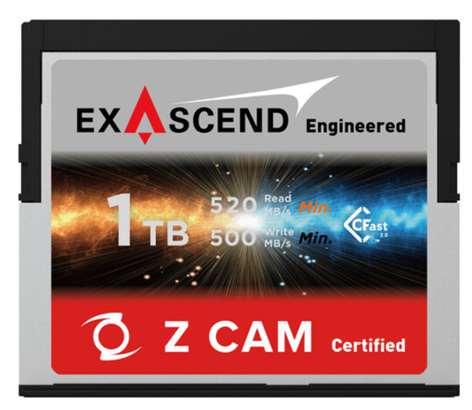 Kartica Exascend EXSZ3X001TB 1TB Z CAM CFast 2.0 zagotavlja hitrost branja 520 MB/s in hitrost pisanja 500 MB/s na ravni podjetij za kinematografijo brez izpadov. VPG-130 certificirana s prilagodljivim nadzorom temperature (ATC), robustno industrijsko zasnovo (-5 °C~70 °C) in tovarniško obnovitvijo podatkov – optimizirana za platforme Z CAM.