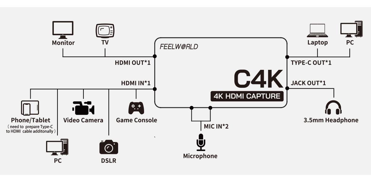 C4K plug and play, združljiv z operacijskimi sistemi Windows (potreben je protokol UVC), Mac OS (10.12 in novejši) in Linux; podpira več programov za zajem, kot so OBS, XSplit, Potplayer in Quicktime.