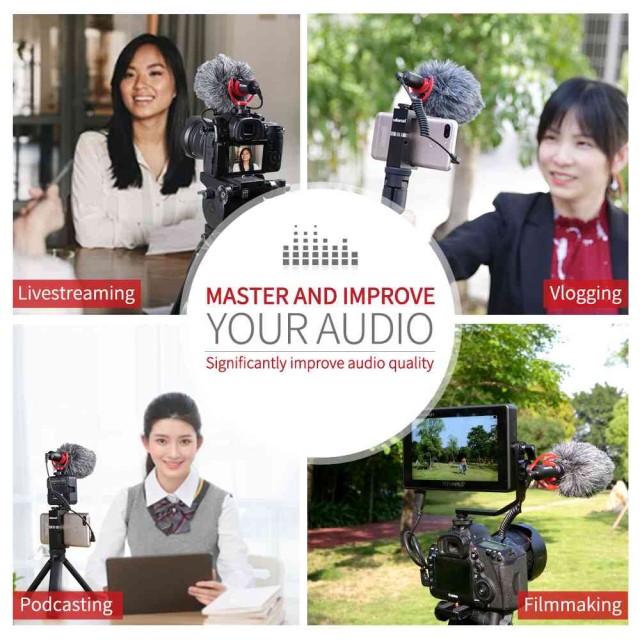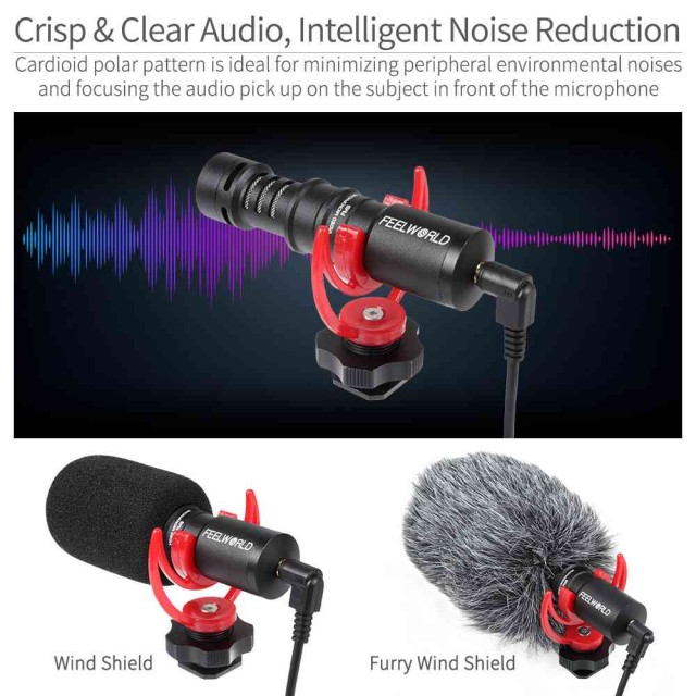 Praktičen in lahek – video mikrofon tehta le 42 g in je enostaven za prenašanje. Za DSLR kamere ali pametne telefone ni potrebna baterija. Kardioidni mikrofon z blažilcem udarcev lahko zmanjša periferni hrup iz okolice.