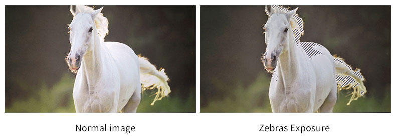 Izpostavljenost se uporablja kot pripomoček za nastavitev ekspozicije v načinu vzorca Zebra. Šteje se, da je prekomerno osvetljena, in prikaže premikajoče se opozorilne črte na prekomerno osvetljenem območju. Na voljo je vrednost zebre v razponu od 1 do 100 %, ki jo je mogoče nastaviti.