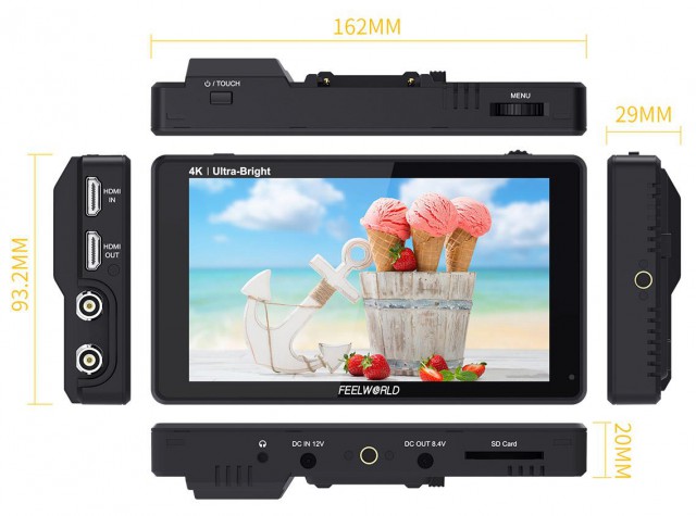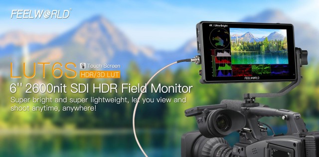 6-palčni monitor kamere z visoko svetilnostjo (2 600 cd/m²) z zaslonom na dotik in podporo za popravljanje 3D LUT (vgrajene 3D LUT HLG 2020, HLG 709, HLG P3 HDR in Rec709 De-slog3/SLog2, SLog3, LogC, V-Log prednastavitve; ali uvoz lastnih do 50 datotek LUT prek kartice SD). Na voljo so LUT-ji za do 50 LUT-jev na datoteko. Kabel Mini/Micro HDMI-HDMI in nosilec za montažo. Različica LUT6S z vhodom/izhodom 4K HDMI in 3G-SDI.