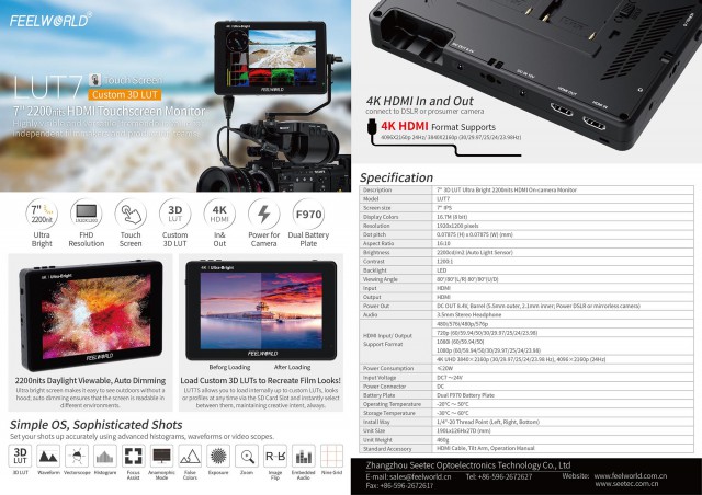 7-palčni monitor kamere z visoko svetilnostjo (2 200 cd/m², vključno s senzorjem okoliške svetlobe za samodejno prilagajanje svetilnosti), zaslonom na dotik in podporo za popravke 3D LUT (vgrajena prednastavitev "Log to Rec.709" ali uvoz lastnih datotek .cube). Priložen mu je nabor datotek "Retrofit". Kabel mini/mikro HDMI-HDMI in montažni nosilec. Različica LUT7 z vhodom/izhodom 4K HDMI.