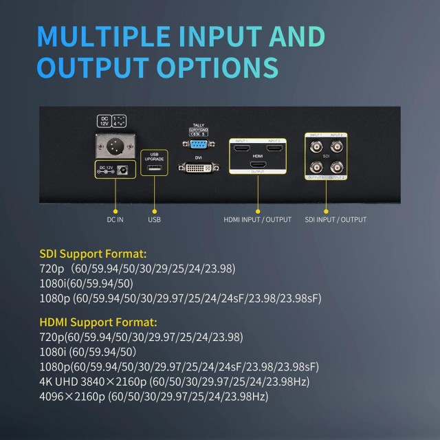 Monitor je opremljen s priključki 3G-SDI, HDMI2.0 in DVI, zato je združljiv s profesionalnimi videokamerami in najnovejšimi digitalnimi brezzrcalnimi fotoaparati.