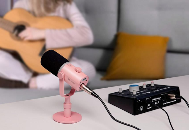 Feelworld PM1 je profesionalni dinamični mikrofon v elegantni roza barvi, ki je kot nalašč za pretakanje in podcasting. Ima vsestranske izhode USB-C in XLR, kardioidno polarno vzorec in dinamično večbarvno RGB osvetlitev. Mikrofon je opremljen s kovinskim namiznim stojalom za priročno namestitev.