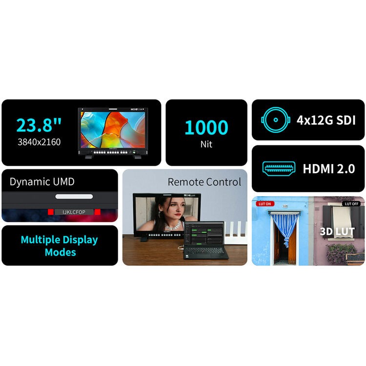 FeelWorld S24 je 23,8-palčni 4K/8K IPS video monitor z visoko svetlostjo, zasnovan za profesionalno produkcijo in postprodukcijo. Z štirimi 12G-SDI vhodi/izhodi, HDMI I/O, svetlostjo 1000 nitov, sistemom osvetlitve EL Zone, podporo 3D LUT in večkamernim multiview je idealen za neposredno oddajanje, spremljanje na snemalnem prizorišču in delovne tokove, pri katerih je barva ključnega pomena.
