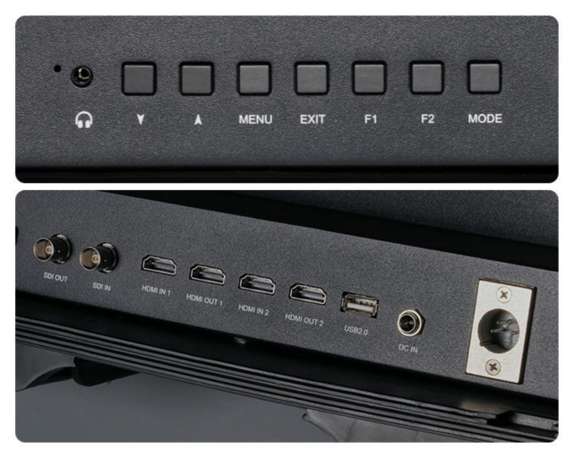 Na desni in zgornji strani kovčka sta dva navoja 1/4, ki ju lahko namestite z brezžičnim prenosom videa ali drugo opremo. Poleg tega je na dnu kovčka vgrajen kovinski nosilec, monitor lahko preprosto namestite na stativ ali svetlobno stojalo.