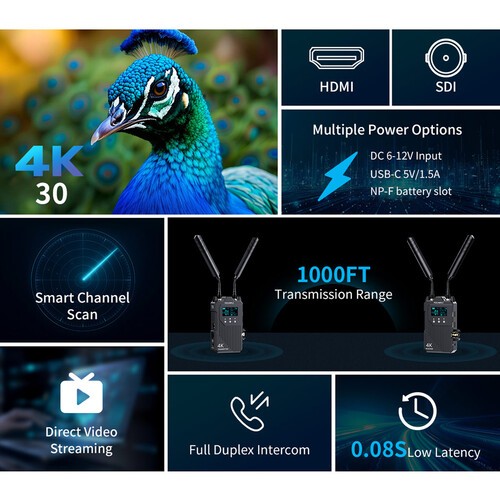 Oddajnik ima SDI vhod, HDMI vhod in HDMI izhod, sprejemnik pa ponuja SDI in dvojni HDMI izhod za prilagodljive nastavitve spremljanja. WT1S podpira do UHD 4K30 in Full HD 1080p60 ter zagotavlja jasen, visokokakovosten video v različnih delovnih tokovih – od kinematografskih kamer do brezoglednih sistemov.