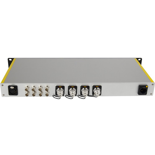 Fiber Dock One ima štiri hibridne vhode za optična vlakna, s katerimi lahko priključite do štiri optične priključke Monk PTZ. Ti priključki omogočajo upravljanje, distribucijo energije in spremljanje do štirih kamer PTZ 3G-SDI. S to konfiguracijo lahko preprosto upravljate več kamer z enega osrednjega mesta.