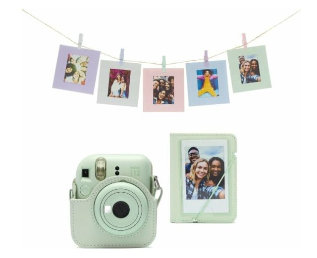 Komplet dodatkov Fujifilm Instax Mini 12 – Mint Green je barvno usklajen komplet dodatkov, zasnovan posebej za fotoaparat Instax Mini 12. Vključuje zaščitni etui za fotoaparat, album za 29 fotografij in komplet za kreativno razstavljanje fotografij s sponkami in vrvico za obešanje – idealno za shranjevanje in razstavljanje vaših trenutnih spominov.