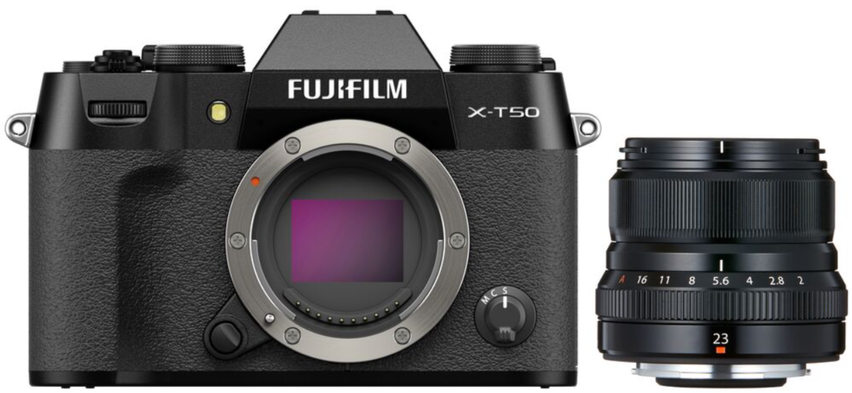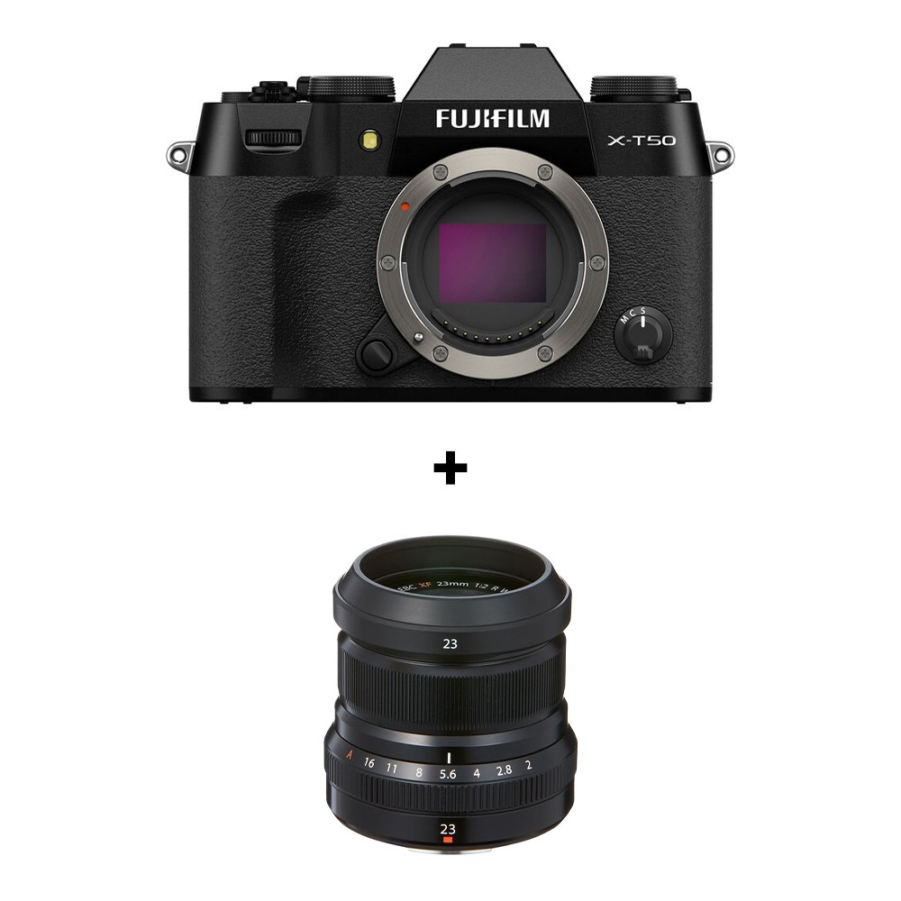 Fujifilm X-T50 Black je kompakten brezogledni fotoaparat APS-C s senzorjem X-Trans CMOS 5 HR z 40,2 MP, procesorjem X-Processor 5, odprtim videom 6,2K/30p, namenskim gumom za simulacijo filma z 20 načini (vključno z REALA ACE), AI AF z zaznavanjem objektov (425 točk, -7 EV), elektronski zaklop do 1/180.000 s, 7-stopinjsko 5-osno stabilizacijo slike IBIS, 2,36-milijonski EVF, 3-palčni 1,84-milijonski zaslon na dotik z nastavljivim kotom in težo 438 g z baterijo – idealna za fotografije in videoposnetke visoke ločljivosti v retro slogu.