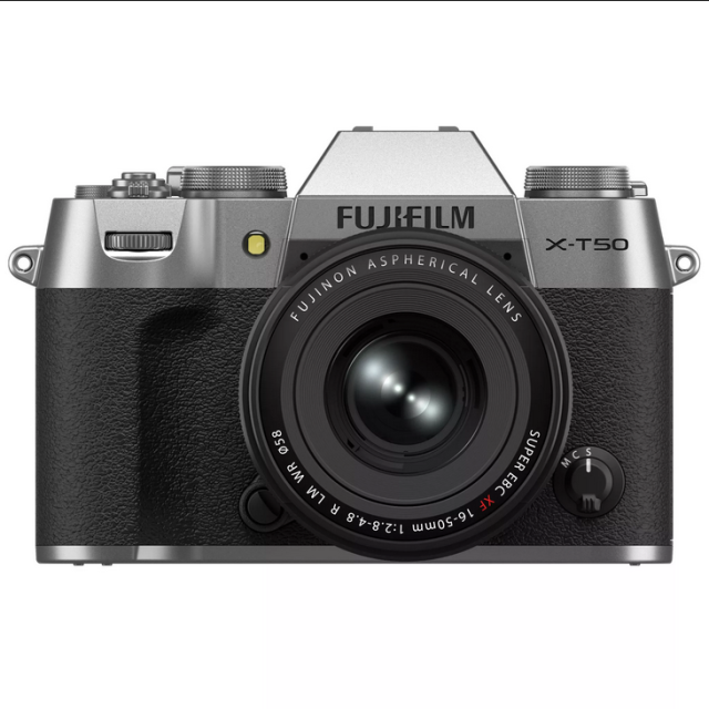 FUJIFILM X-T50 v srebrni barvi v kompletu z objektivom XC15-45mm f/3,5-5,6 OIS je kompakten in lahek brezzrcalni fotoaparat, ki ponuja visoko kakovost delovanja in vsestranske možnosti fotografiranja. Ta kombinacija je idealna za fotografe, ki iščejo prenosen, a zmogljiv sistem fotoaparatov z elegantno zasnovo.