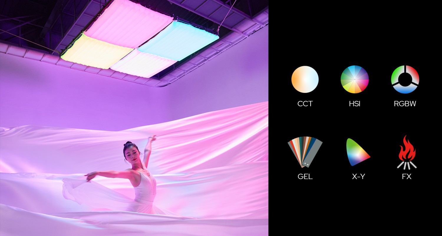 Z močjo 100 W F100R omogoča popoln nadzor nad RGB barvami, širok razpon CCT od 1800 do 10.000 K in natančno nastavitev zelene/magente barve, kar zagotavlja natančno ujemanje barv in kreativno prilagodljivost. Z izjemno barvno zvestobo, ocenjeno na CRI ≥96 in TLCI ≥97, izpolnjuje stroge standarde, zahtevane za uporabo v televizijskih in kinematografskih aplikacijah.