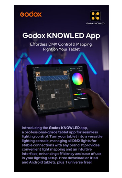 | Light control | DMX, Bluetooth,Godox Light app. |