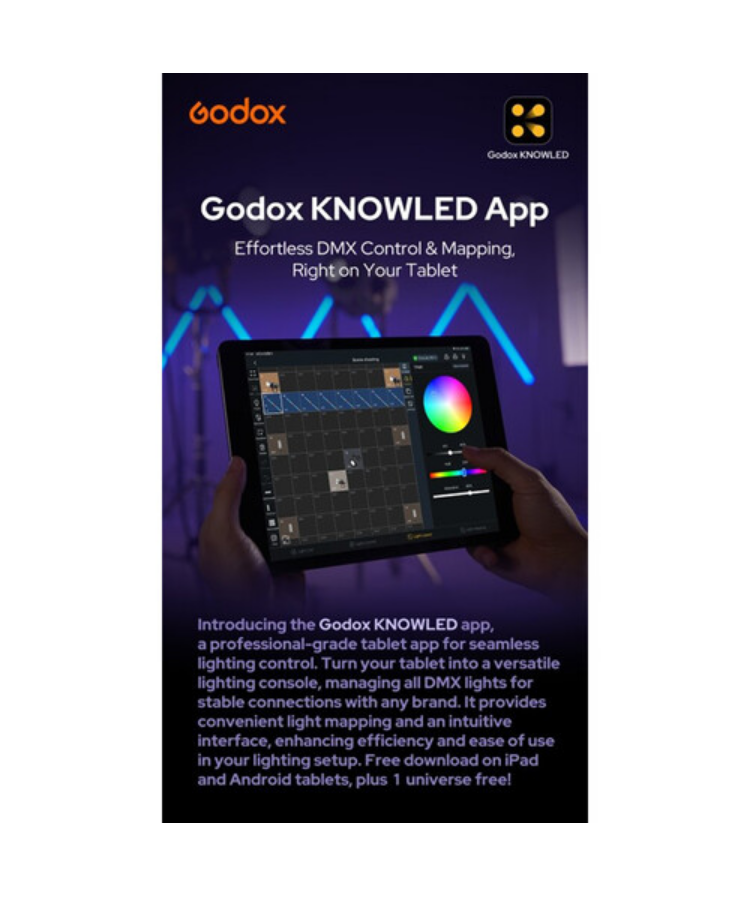 | Light control | On-board, Bluetooth (Godox Light app), DMX512, RDM, CRMX |