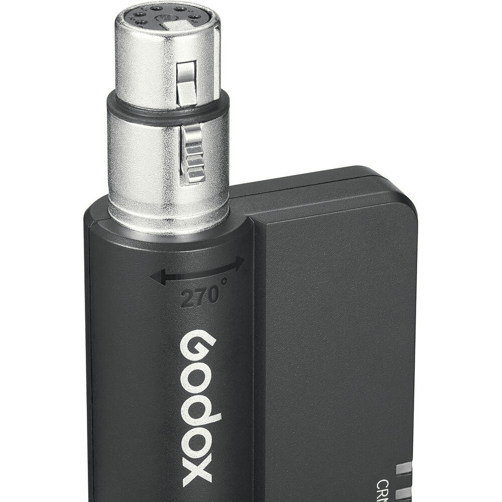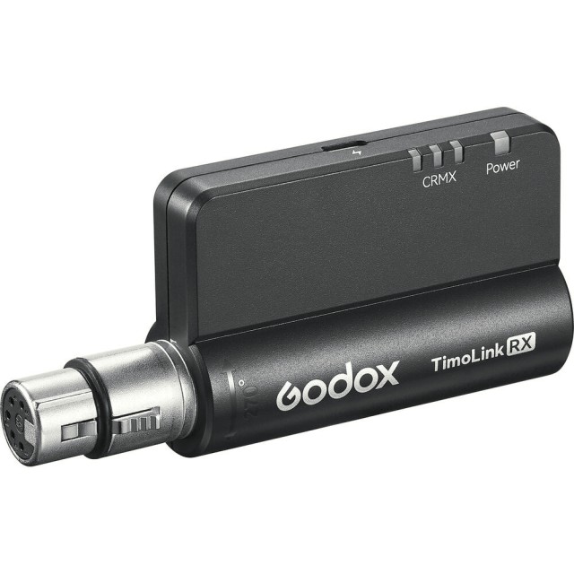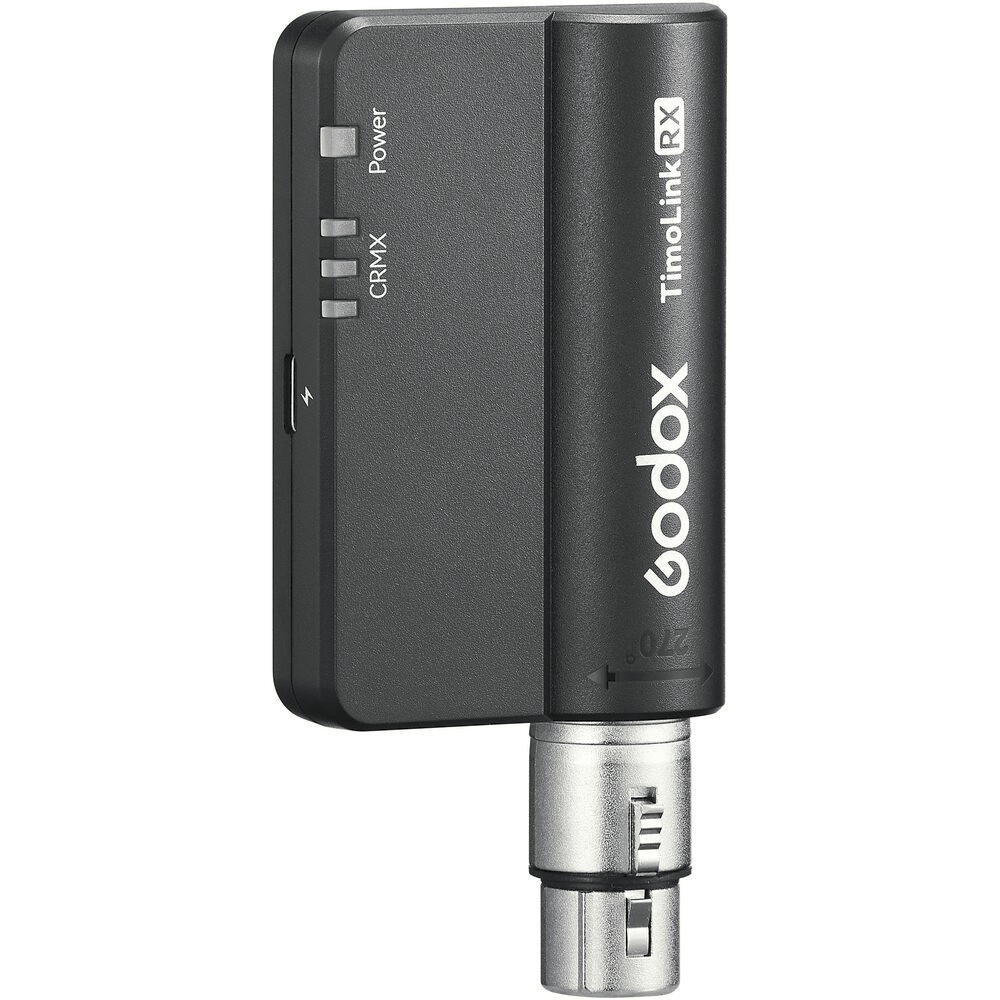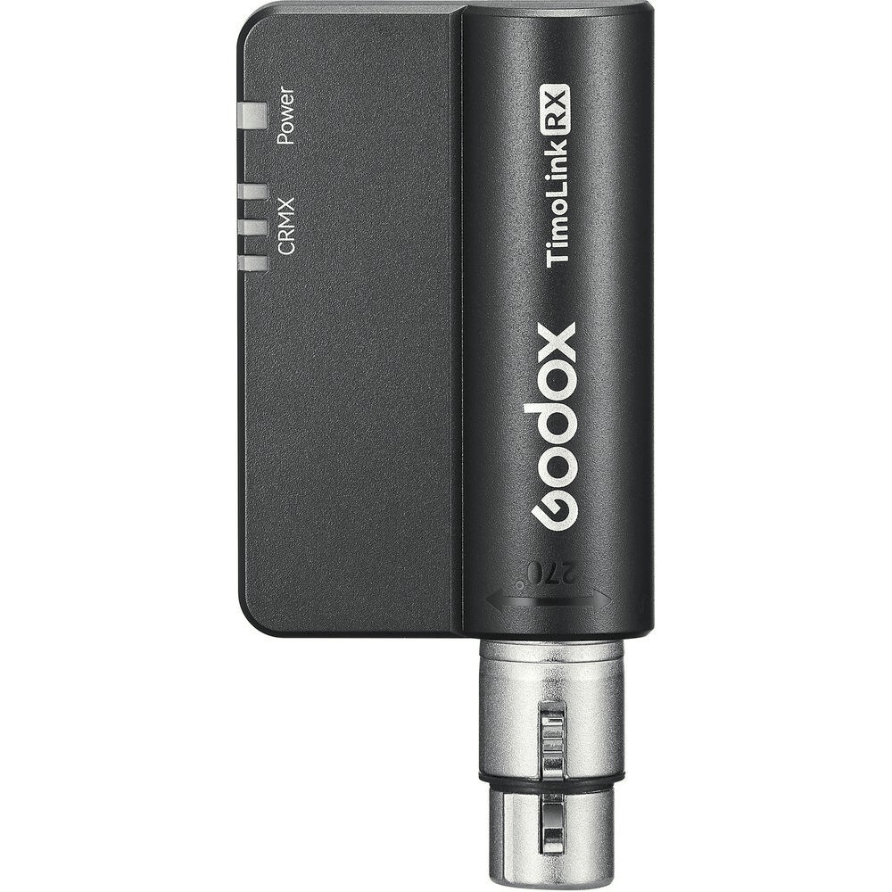 Brezžični DMX sprejemnik Godox TimoLink RX z vgrajenim modulom LumenRadio CRMX omogoča filmskim ustvarjalcem in televizijskim postajam pretvorbo žičnih DMX nastavitev v brezhibno brezžično upravljanje. Z impresivnim dometom 984' in 270° vrtljivim 5-pinskim XLR konektorjem zagotavlja zanesljivo in prilagodljivo povezljivost za široko paleto DMX naprav.