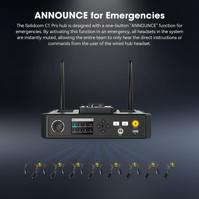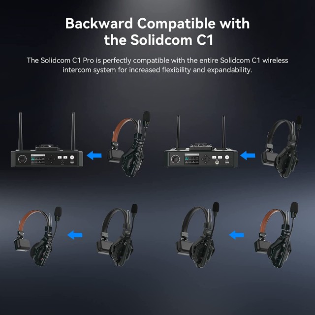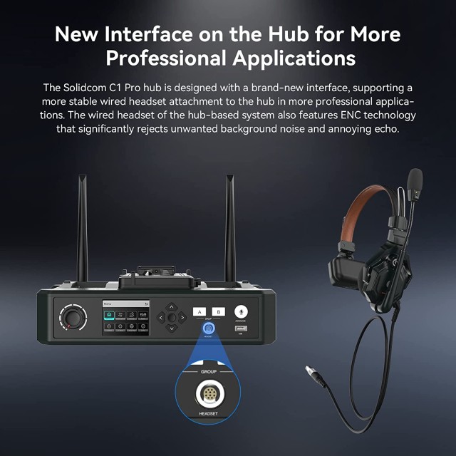 Hollyland Solidcom C1 Pro je popolnoma dvostranski brezžični domofon, ki deluje v pasu 1,9 GHz (DECT 6.0) z dosegom do 350 m (neposredna vidljivost). Ker so vse komponente integrirane v slušalke, zagotavlja največje udobje in enostavno prenosljivost brez dodatnih pasnih ali baznih postaj. Naglavne slušalke tehtajo približno 170 g in so opremljene z rezervno baterijo za neprekinjeno delovanje brez prekinitev. Interkom Solidcom C1 Pro ponuja prenos zvoka v frekvenčnem območju od 150 Hz do 7 kHz, tehnologijo AEC (Acoustic Echo Cancellation), usmerjeni mikrofon za odpravljanje hrupa iz okolice, dodatni vsesmerni mikrofon za zaznavanje okolice in odpravljanje hrupa iz okolja (ENC; lahko ga izklopite), delovanje Push-to-Talk, šifriranje prenosa itd. Na voljo je v več različicah v kompletu za ekipe od dveh do šestih oseb.
