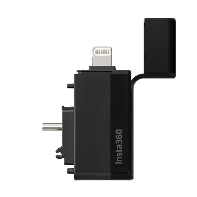 Naprava je opremljena z modulom Plug-And-Play, ki omogoča neposredno povezavo s telefonom in prenos datotek brez uporabe omrežja Wi-Fi. Združljiva je z operacijskima sistemoma iOS in Android. Ko je priključena na fotoaparat, deluje kot zunanji, samostojni pomnilniški modul za shranjevanje videoposnetkov in fotografij neposredno med snemanjem. Čitalnik povežite s telefonom ali tabličnim računalnikom prek priključka USB-C in urejajte datoteke neposredno v aplikaciji Insta360.