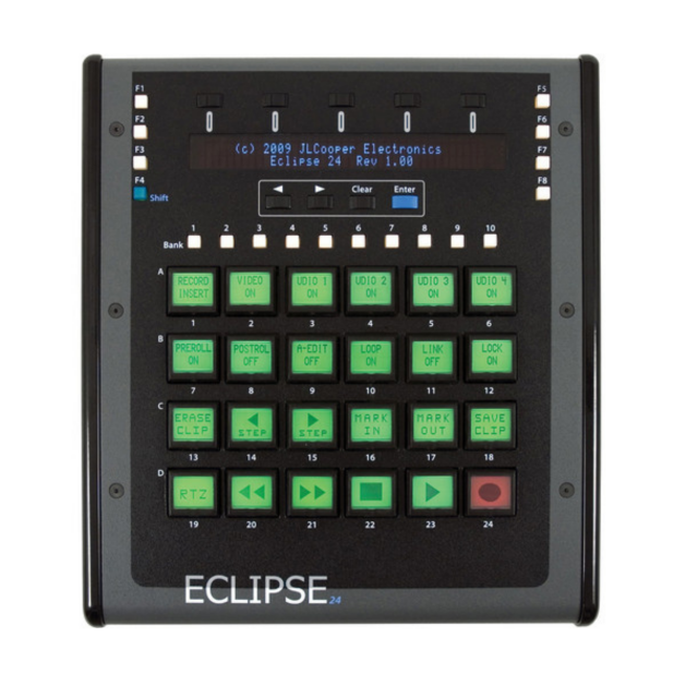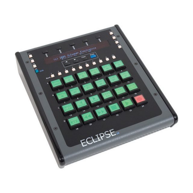 Taktilna ukazna paleta JLCooper Eclipse 24 Midnight ima 24 daljinsko vodenih 64x32 LCD tipk (visoka ločljivost, RGB), ki lahko prikažejo do 40 znakov besedila in grafike z integriranimi zaporednimi ukaznimi vmesniki. Srednje velik namizni krmilnik ima tudi 17 dodatnih funkcijskih in navigacijskih stikal ter 10 bank tipk.