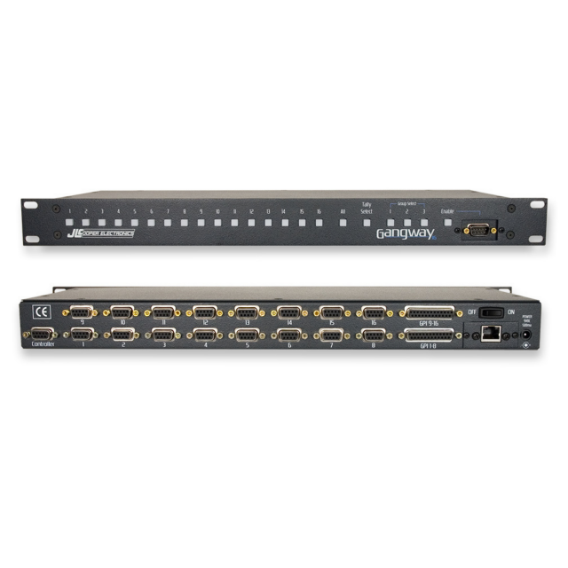 GangWay16 podjetja JL Cooper je kompaktno, enostavno za uporabo enopriključno stikalo RS-422 in stikalo GPI Trigger Box. Omogoča nadzor do 16 odrov ali video strežnikov z enim samim 9-pinskim krmilnikom. Sprednja plošča vključuje osvetljen gumb, ki jasno prikazuje stanje vsakega stroja, gumb za hiter vklop vseh strojev, 3 skupine uporabniških prednastavitev in gumb za izbiro tallyja.