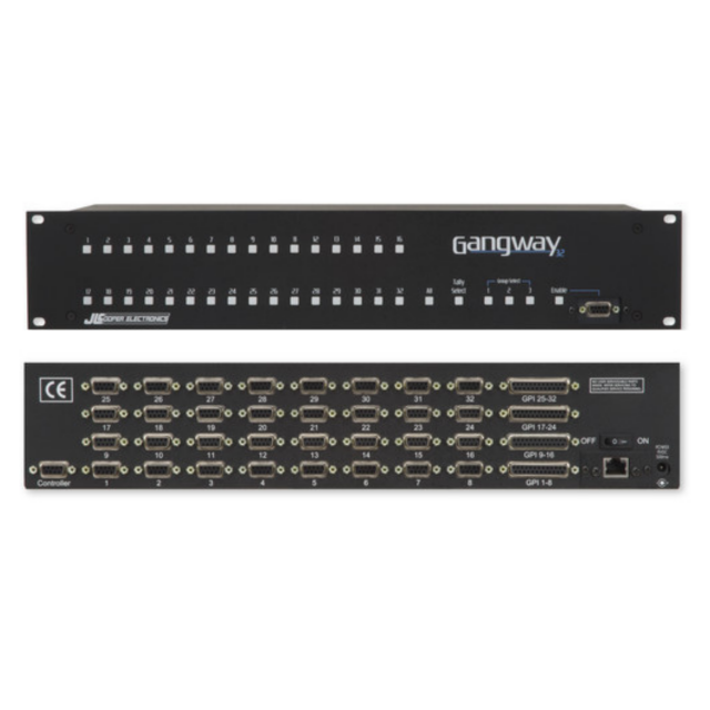 32-portni GangWay32 RS-422 Gang Roll Switcher in GPI Trigger Box podjetja JLCooper ponuja krmilnike na sprednji plošči, ki omogočajo hkratno izbiro do 32 kanalov VTR, DDR ali strežnika. Sprednja plošča vključuje osvetljene gumbe, ki jasno prikazujejo stanje vsake naprave, in sprednja vrata RS-422 za priročno oddaljeno povezljivost. Zadnja plošča vsebuje 32 vrat RS-422, krmilni vhod RS-422 in vrata GPI (General Purpose Interface).