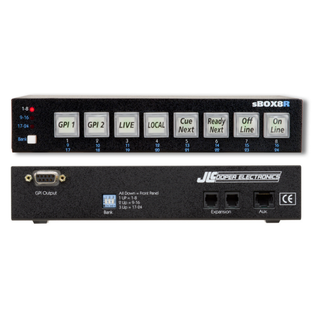 Različica daljinskega sprožilca za gBox in eBox za montažo na stojalo povezuje sBOX z gBOX (GPO Trigger Box) ali eBOX (Quad Serial/Ethernet/GPI Interface) kot preprost daljinski upravljalnik za sprožanje dogodkov GPO. Poleg tega lahko napravo eBOX uporabite za sprožitev pošiljanja uporabniško programiranih zaporednih ali ethernetnih sporočil. Ta daljinski sprožilec je opremljen z 8 gumbi z osvetlitvijo LED in osvetljenim bančnim stikalom, ki omogoča upravljanje do 24 GPO z enim samim daljinskim sprožilcem. Več enot daljinskega sprožilca (do 3) lahko zagotovi namenske gumbe za do 24 GPO. To kompaktno enoto lahko namestite za računalniško tipkovnico.