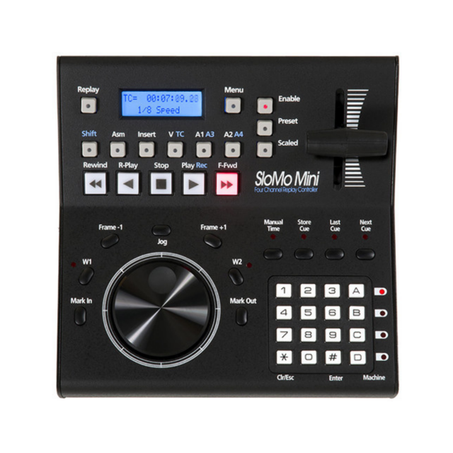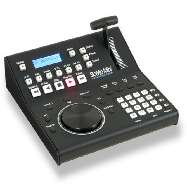 JLCooper SloMo Mini je krmilnik za takojšnje predvajanje, zasnovan za novice, šport, tablo in druge scenarije počasne montaže, ki se lahko prek povezave RS-422 poveže z do štirimi odejami VTR hkrati. S programirljivim kolescem ali številčno tipkovnico lahko v realnem času izberete določene posnetke in jih nato upravljate s pomočjo palice T. S pomočjo priloženega štirismernega razdelilnika/napajalnega kabla je SloMo Mini združljiv s številnimi standardnimi VTR-ploščami in strežniki, ki podpirajo nadzorni protokol RS-422, vključno z AJA KiPro, Blackmagic Design HyperDeck Studio in VideoDevices PIX 250i, 260i in 270i. Nadaljnja razširitev z ločeno dobavljivima škatlama Gangway 16 in Gangway 32 omogoča hkratni nadzor veliko več dekoderjev, kot jih omogoča priloženi standardni kabel.