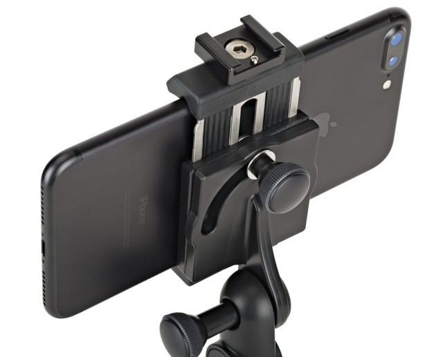 GripTight PRO 2 GorillaPod je opremljen z odstranljivim držalom za pametni telefon, ki ga je mogoče nastaviti v pokončni ali ležeči položaj. Poleg tega ima držalo za telefon na vrhu hladno stopalko in na straneh dva 1/4"-20 navoja za pritrditev mikrofona, svetlobe in drugih dodatkov. Odstranitev nosilca razkrije še en navoj 1/4"-20 za pritrditev dodatkov. Nosilec za telefon, nastavljiv med 5,6 in 8,9 cm, podpira večino pametnih telefonov.