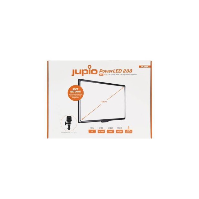 Jupio PowerLED 288A je velika luč LED, ki vam lahko priskoči na pomoč pri fotografiranju ali snemanju videoposnetkov. Ponaša se z izjemno diagonalo 42 cm, kar pomeni, da lahko zagotovi močan vir svetlobe in osvetli prizor v vseh svetlobnih pogojih. Velika luč je sestavljena iz 288 žarnic LED, ki omogočajo enostavno nastavitev temperature beline in svetlosti. Na splošno topla bela svetloba pomaga vzbuditi občutek sproščenosti, hladen ton pa spodbuja koncentracijo pri delu. Trenutne nastavitve obeh vrednosti lahko spremljate prek preglednega zaslona LCD.