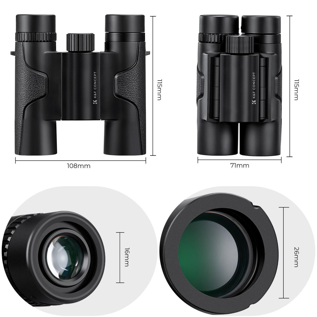 Daljnogled K&F 10x25 HD zagotavlja visoko ločljivost slike v kompaktni in lahki izvedbi. Opremljen je s prizmatskimi lečami BaK4, večplastnimi lečami FMC s 99-odstotno prepustnostjo svetlobe in vodotesnim ohišjem IP65. Daljnogled zagotavlja jasne in živahne slike za potovanja, opazovanje narave in dejavnosti na prostem, hkrati pa ostaja prenosljiv in ergonomski.